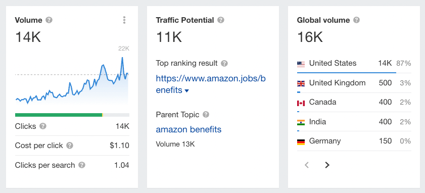Given that over 14k people search on Google for "Amazon benefits" per month, it's clearly important to offer good perks to your staff if you want to attract the best candidates.
