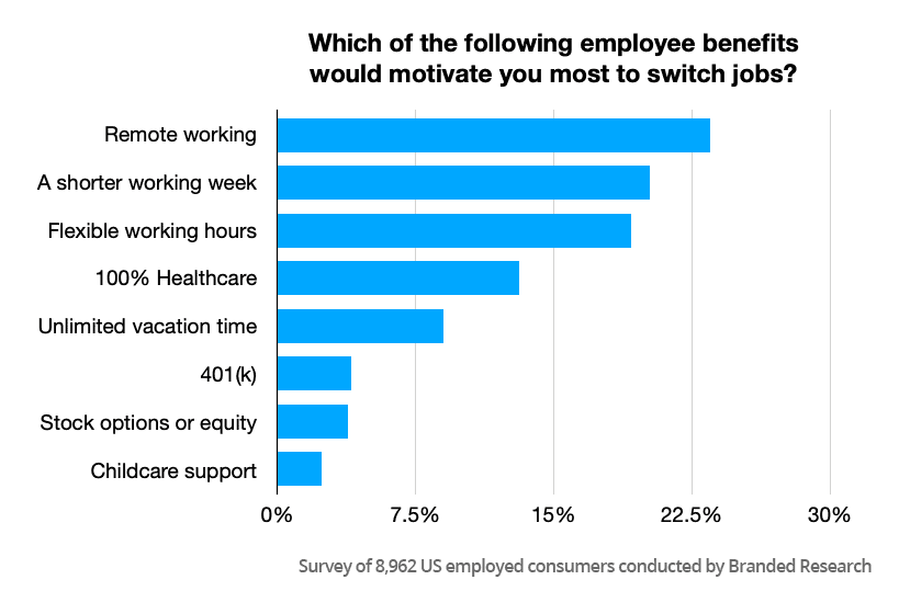 Based on our survey, 23.5% of Americans say they would be most motivated to switch jobs for permanent work-from-home/remote working.