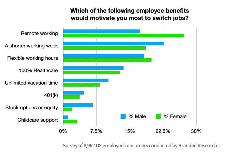 - Men are more likely than women to say that they are most motivated to switch jobs for a shorter work week (22.6% vs 18.6%)
