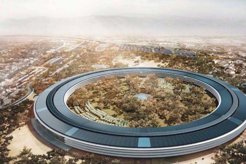 Jobs set out his vision for a new Apple campus before his death in 2011, requiring that Apple Park is more like a nature reserve than an office complex. Orchards in this green space provide fruit for the cafeteria and entire ring is covered in solar panels.
