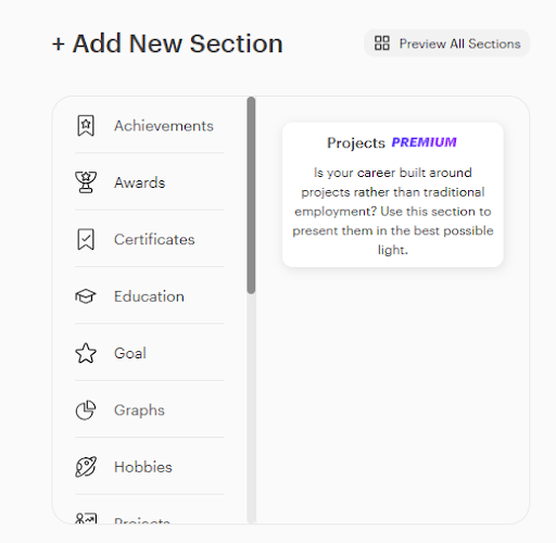- Adding extra sections: You can customise your resume further by including additional sections like Achievements, Awards, Certificates, Projects, and more. However, most of these are locked behind the Premium plan. The Education section is one of the few that’s accessible during the free trial, giving you a taste of the customization options available.