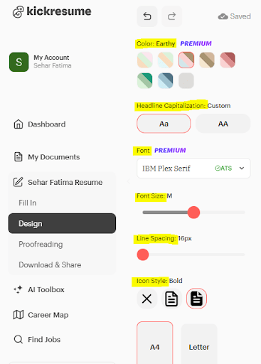 Kickresume provides robust design customization features. You’ll find font options, line spacing, icon styles, color themes, and headline capitalization settings.