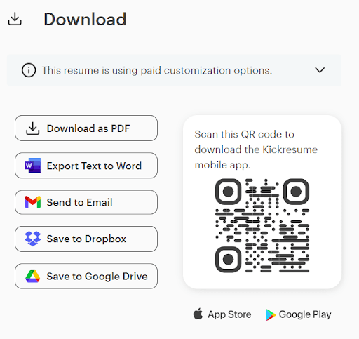 Flexibility in exporting your resume is crucial. When it comes to exporting resumes, Kickresume does a solid job offering flexibility, but there are a few things to keep in mind.