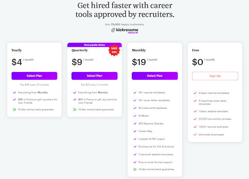 In all the plans, Kickresume offers a 14-day money-back guarantee. This way, you can try out the Premium features risk-free.