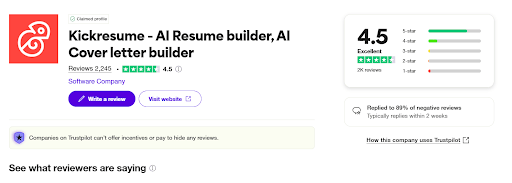 Trustpilot reviews present a mixed yet predominantly positive picture of Kickresume. With an average rating of 4.5 out of 5 stars based on 1,892 reviews, the platform is lauded for its ease of use, quality templates, and helpful AI features. However, some users believe there is room for improvement in customization capabilities and user interface design.