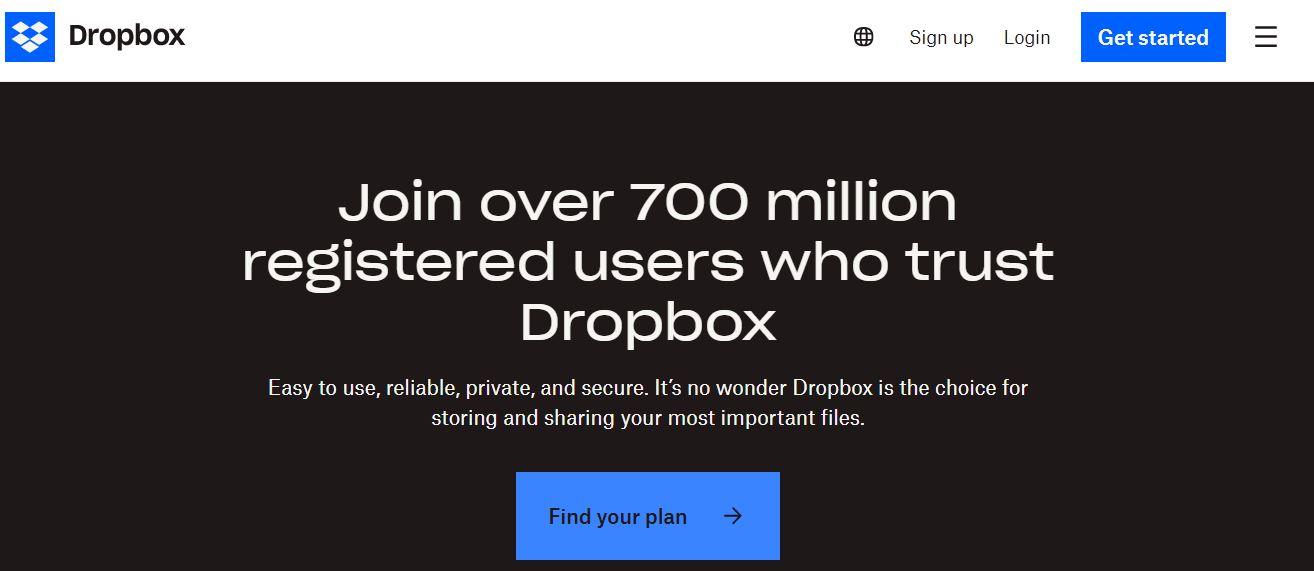 | Dropbox | Real-time collaborative editing, Integration with popular tools, Real-time syncing, Robust data protection, Secure transfer of files | Files and documents management | Plus: $9.99/month, Essential: $18/month, Business: $20/user/month, Business Plus: $26/user/month | 4.4/5 |