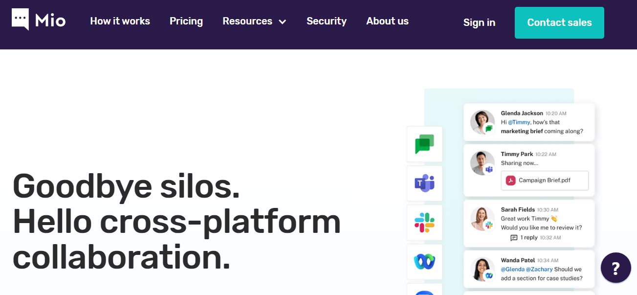 | Mio | Interoperability among messaging apps, Group chats, Channel synchronization, File sharing with enterprise-grade security | Communication across different platforms | Free, Flex: $5/member/month, Pro: $1k/member/month Enterprise | N/A |