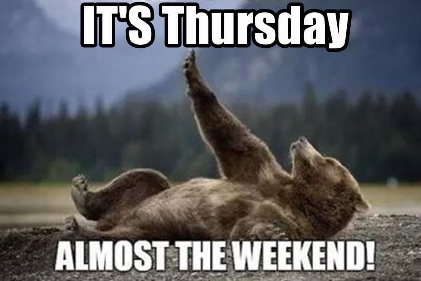 This meme shows a bear lying on its back with one arm raised in the air. He appears to be pretty happy about it being Thursday. The text says, "It's Thursday: Almost the weekend."