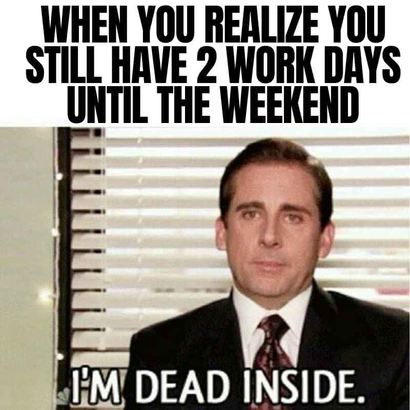 Another meme from The Office shows a character looking thoroughly worn out. The text around him says, "When you realize you still have two work days until the weekend. I'm dead inside."