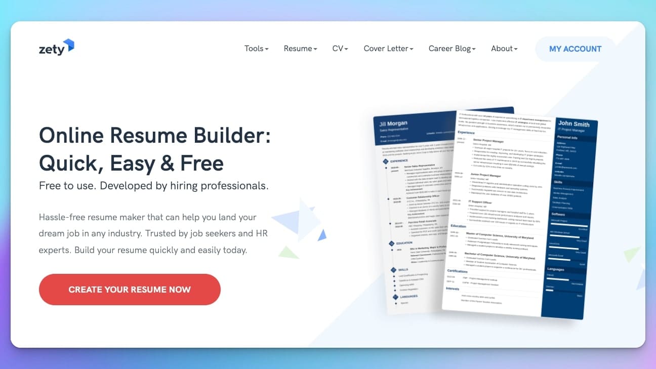 | 4. Zety | $2.99 for two-week access | On Free Plan | 8.5 |