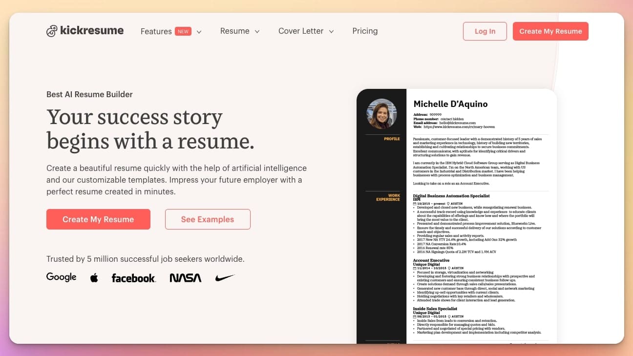 Kickresume's online resume builder streamlines the process of creating a professional resume. After logging in, you begin by completing a quick questionnaire about your personal information, work experience, education, skills, and hobbies. The platform then generates your resume, which you can customize by adding personal details, changing resume formats, reordering sections, and more.