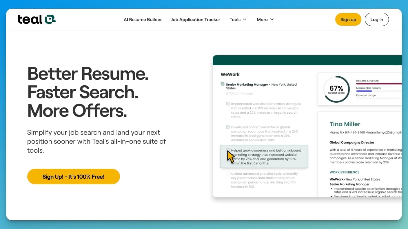 Teal builds resumes, organizes job searches, researches job openings, and keeps you motivated. It is a comprehensive, user-friendly tool for creating professional resumes for entry-level and experienced job searchers.