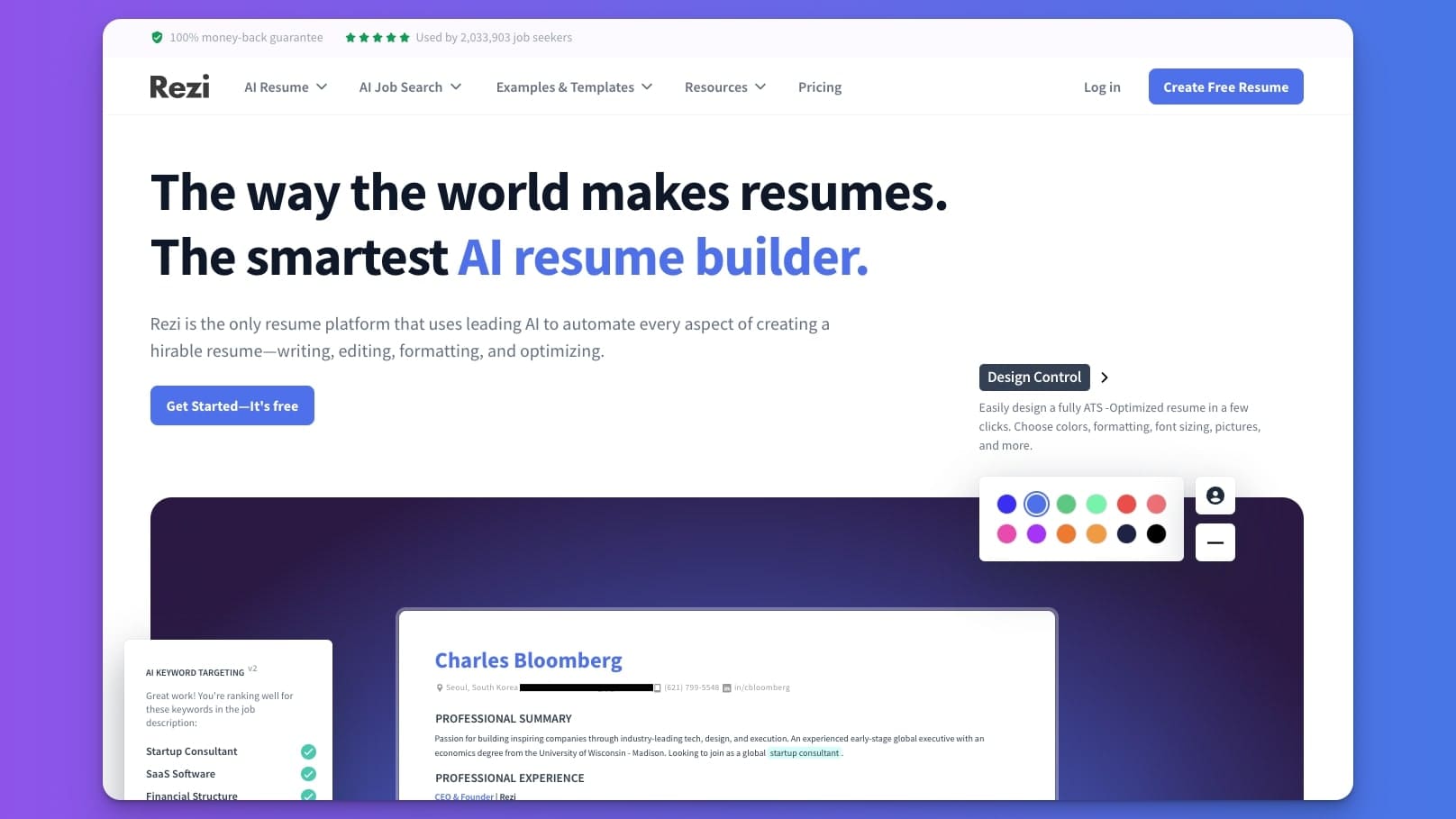 Rezi is an AI-powered resume creator which offers pre-written content for different sections of your resume. Each summary is crafted for a specific job within your industry and optimized with keywords to pass through the Applicant Tracking System (ATS).
