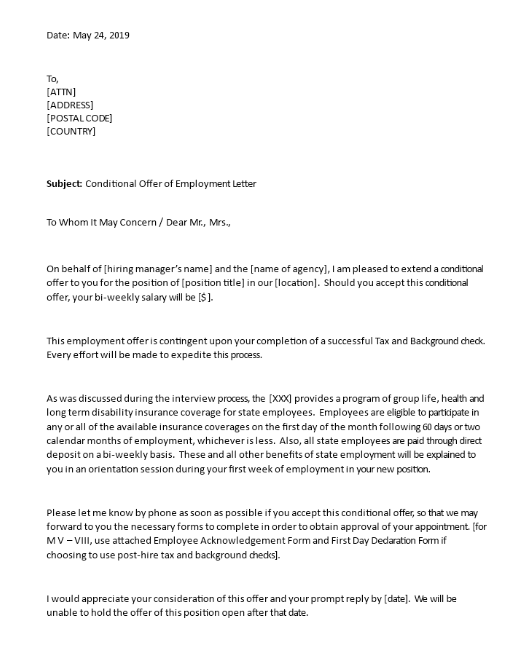 As you can see, the letter will include things like an official job offer statement, contract details, salary information, a list of the conditional requirement/s, an explanation of why, and the next steps they involve.