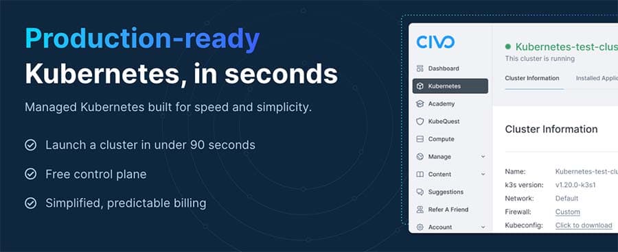 88 · ExcellentDeveloper-focused cloud platform offering production-ready Kubernetes clusters in seconds, pioneering the world's first K3s-powered managed Kubernetes service.