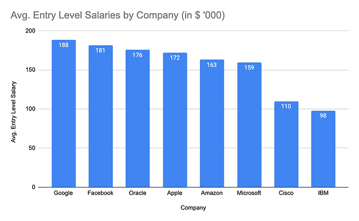As can be seen, the gap between salaries at FAANG companies increases dramatically between Apple and Microsoft with experience.