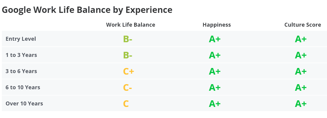 Googlers with more experience also report a worse work-life balance. In particular, employees with 6-10 years of experience report the lowest Google work-life balance score of C-. For this reason, senior employees or managers at Google may face more complications in meeting expectations during an 8-hour workday.