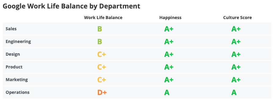 If you’re working for design, product or marketing, you may experience a more middle-ground rating of C+. Though Google work-life balance is rated higher than most other tech companies, it may not be the WLB found in departments such as sales and engineering.